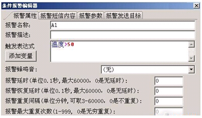 (3)配置报警条件,温度值VW100>50,短信模块向值班人员发送短信。